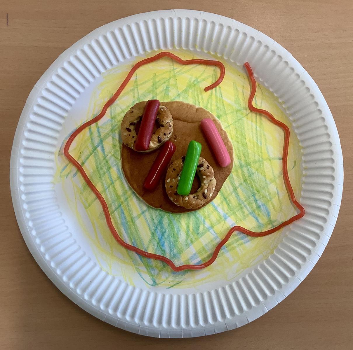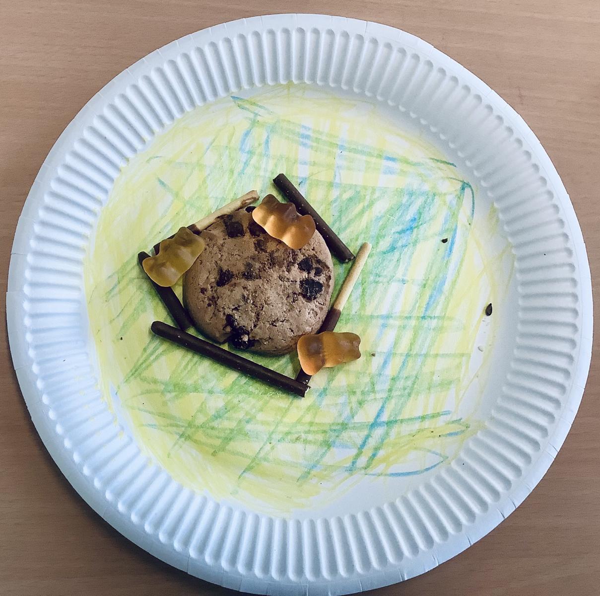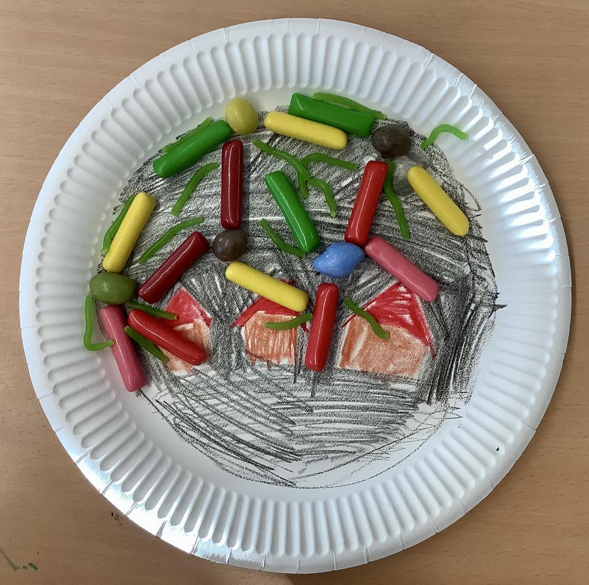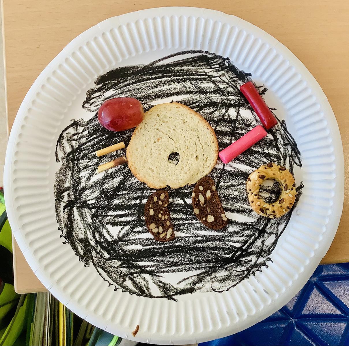 Dazu durften Pappteller als Hintergründe gestaltete werden, die Themen mussten aber durch Lebensmittel in Szene gesetzt werden.